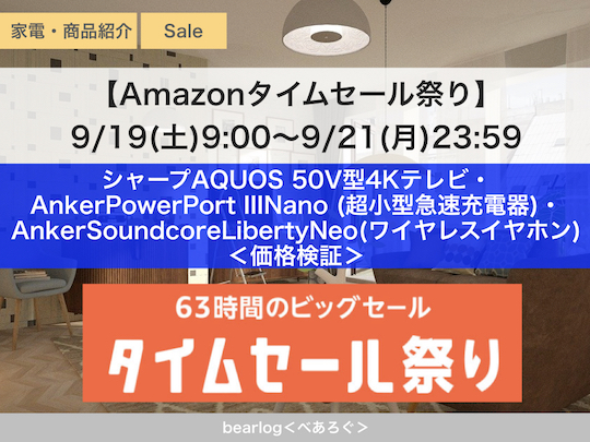 Amazonタイムセール祭りが9/19~9/21の3日間限定で開催されています。タイムセール対象で目玉となっているAQUOS50V型4Kテレビ・AnkerPowerPort ⅢNano・AnkerSoundcoreLibertyNeoについて、通常価格・過去の最安値と比較してお買い得なのか説明します。 -